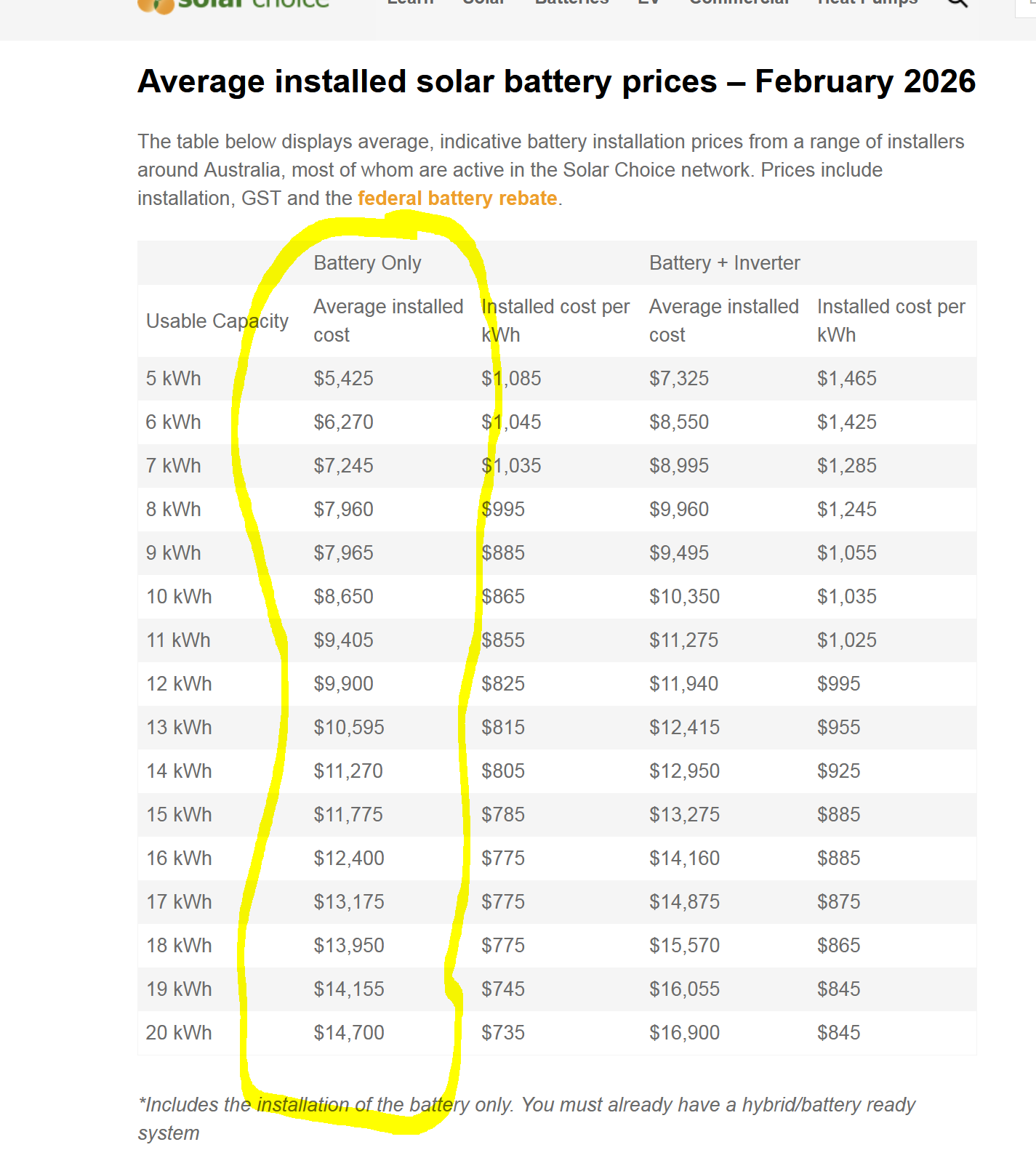 - Choose the Battery Only Average Installed price